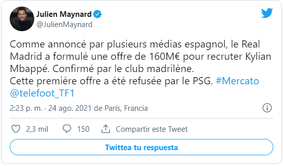 Ante esta primera oferta, el PSG no demoró en responder y según el twitter de Julien Maynard, periodista de Telefoot (programa de fútbol en Francia) esta oferta habría sido rechazada.
