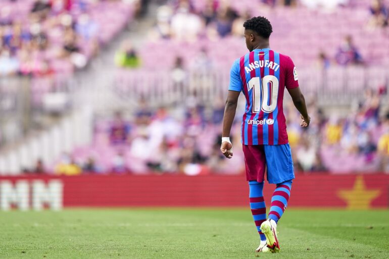 13’ El balón parte en la portería de Ter Stegen, tras un gran juego colectivo el balón termina en los pies de Ansu Fati, hace una pared con Depay y lanza un derechazo hacia el palo lejano del portero. Al mismo estilo de Leo Messi, pero desde el otro ángulo.