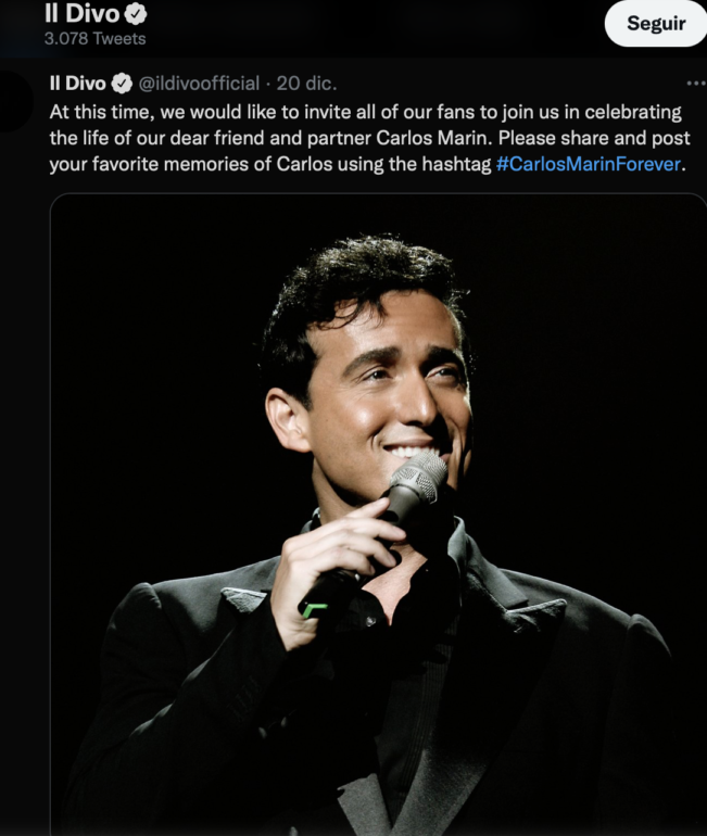 Este ultimo domingo por medio del twitter oficial de la agrupación, comunicaron el sentido fallecimiento de su integrante. “Con gran pesar les hacemos saber que nuestro amigo y socio Carlos Marín ha fallecido. Sus amigos, familiares y fanáticos lo extrañarán. Nunca habrá otra voz o espíritu como Carlos.” Añadió.